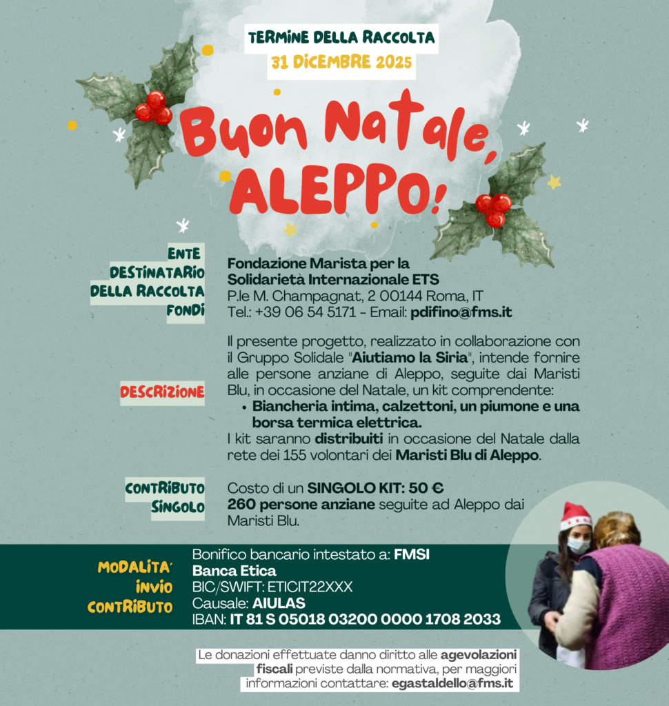 La campagna Natale 2025 “Buon Natale, Aleppo!”, realizzata da AIULAS e la Fondazione Marista per la Solidarietà Internazionale (FMSI), si è conclusa con successo. Dopo la campagna dello scorso anno dedicata alla fornitura di olio, quest’anno l’attenzione si è concentra sugli anziani seguiti quotidianamente dai Maristi Blu.