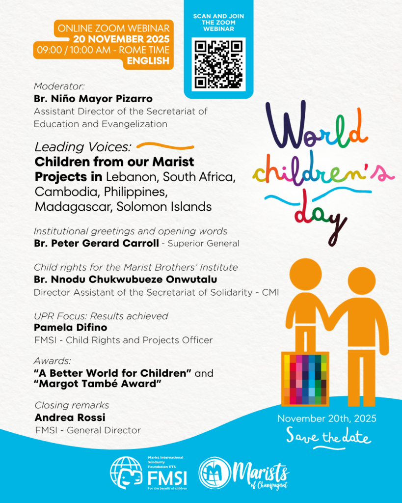 On 20 November 2025, the Global Marist Family gathered once again to celebrate World Children’s Day, united by a simple yet powerful conviction: every day is Children’s Day. Across two online sessions —in English and Spanish, moderated by Br. Niño Pizarro and Br. Diego Zawadzky— hundreds of participants from 60 countries joined to listen, share, and reaffirm a mission deeply rooted in the Marist identity: standing beside children, protecting their dignity, defending their rights, and believing in their possibilities.