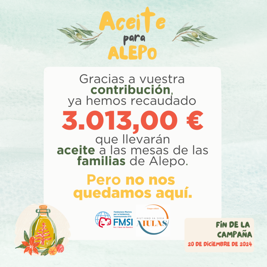 Para la Navidad de 2025, AIULAS y la Fundación Marista para la Solidaridad Internacional (FMSI) renuevan su compromiso con la comunidad de Alepo. Tras la campaña del año pasado dedicada al suministro de aceite, este año la atención se centra en las personas mayores que reciben cuidado diario de los Maristas Azules.